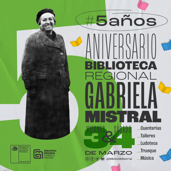 Este viernes 3 y sábado 4 de marzo la Biblioteca Regional de Coquimbo Gabriela Mistral invita a una especial programación de actividades para celebrar su quinto aniversario de funcionamiento. Año a año, se ha consolidado en la región como un espacio de diálogo, con actividades culturales abiertas y lecturas de todo tipo, adaptándose a los tiempos y contextos diversos para seguir acompañando a la comunidad. Este 2023, para conmemorar el hito, su equipo organizó una serie de iniciativas abiertas y gratuitas para todo público, con el fin de seguir entregando una experiencia en torno a los libros, facilitando el acceso al conocimiento y la información a cada visitante.