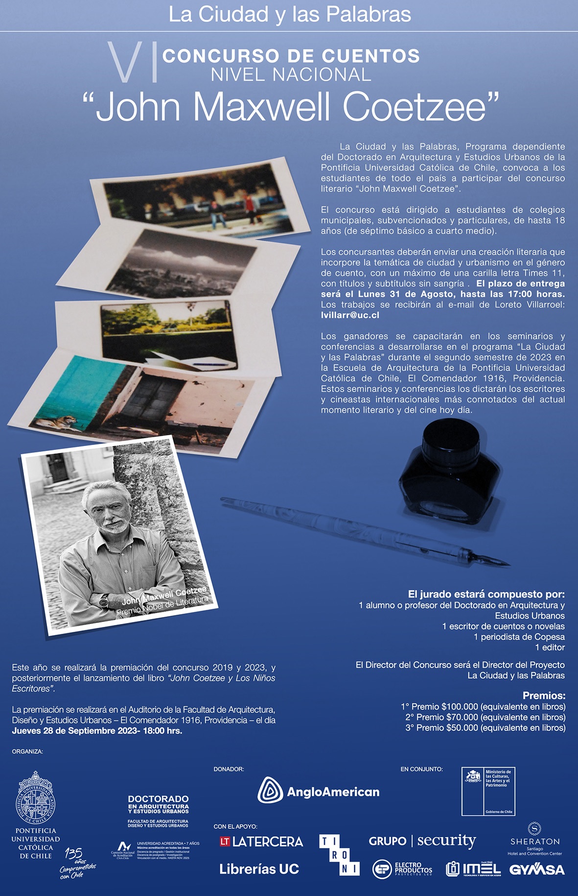 El certamen está dirigido a estudiantes que cursen desde séptimo básico hasta cuarto medio (con edad tope de 18 años), que quieran escribir un cuento sobre de la ciudad y el urbanismo. La obra debe ser enviada hasta el jueves 31 de agosto, hasta las 17:00 horas, al correo electrónico lvillarr@uc.cl.