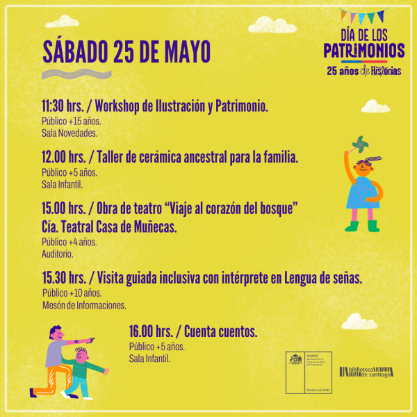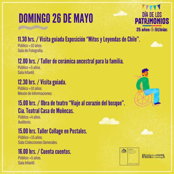 Este sábado 25 y domingo 26 de mayo ven con tu familia y amigos a la Biblioteca para conmemorar una vez más estas importantes fechas para la cultura y tradición de nuestro país. Talleres, visitas guiadas inclusivas con lengua de señas a exposiciones y espacios, una obra de teatro que realza el patrimonio ambiental y un cuentacuentos ad hoc son algunas de las actividades gratuitas que este fin de semana podrás disfrutar en Matucana 151.