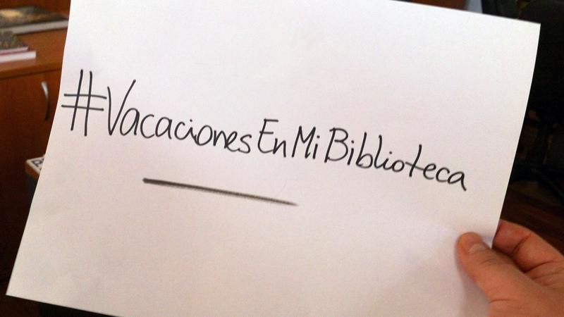 Y para ponernos a tono hemos preparado un entretenido concurso. ¿Cómo participar? Sólo tienes que visitar alguna biblioteca pública durante tus vacaciones y tomarte una fotografía sosteniendo una hoja o cartel donde esté escrito "#VacacionesEnMiBiblioteca" (como en el ejemplo). Además cuéntanos en dos o tres líneas a qué actividad asististe o participaste.