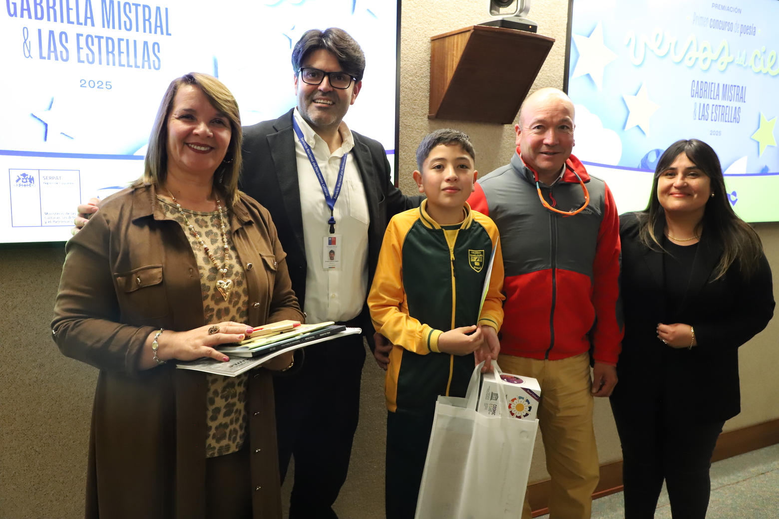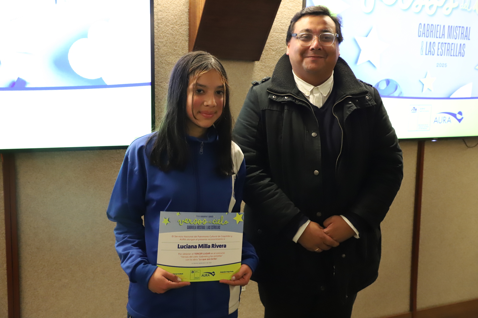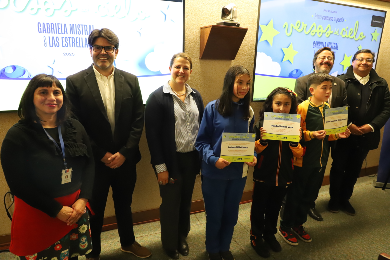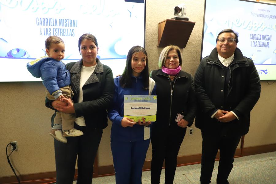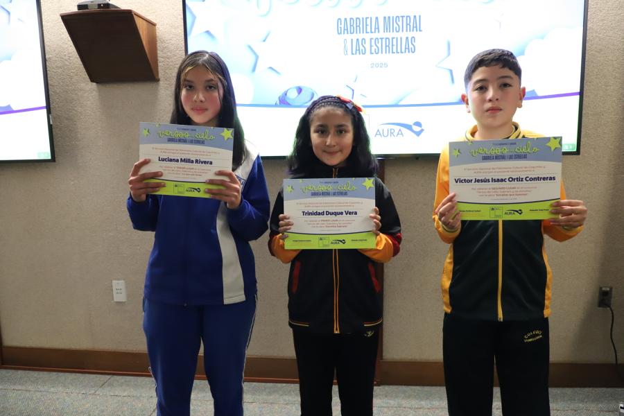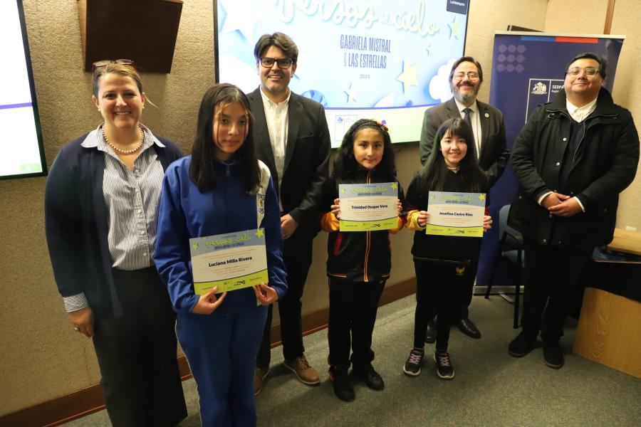 Una de las actividades más significativas de este primer concurso de poesía escolar regional “Versos del cielo: Gabriela y las estrellas”, se realizó el viernes 05 de septiembre, con la ceremonia de premiación de los tres primeros lugares del certamen, además del reconocimiento a las 10 menciones honrosas, provenientes de todos los establecimientos educacionales que participaron en la ocasión.
