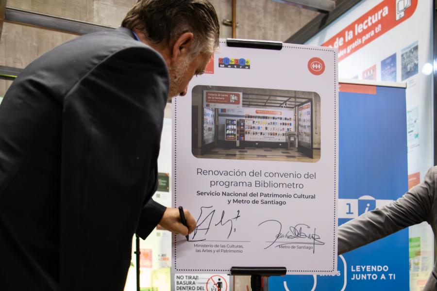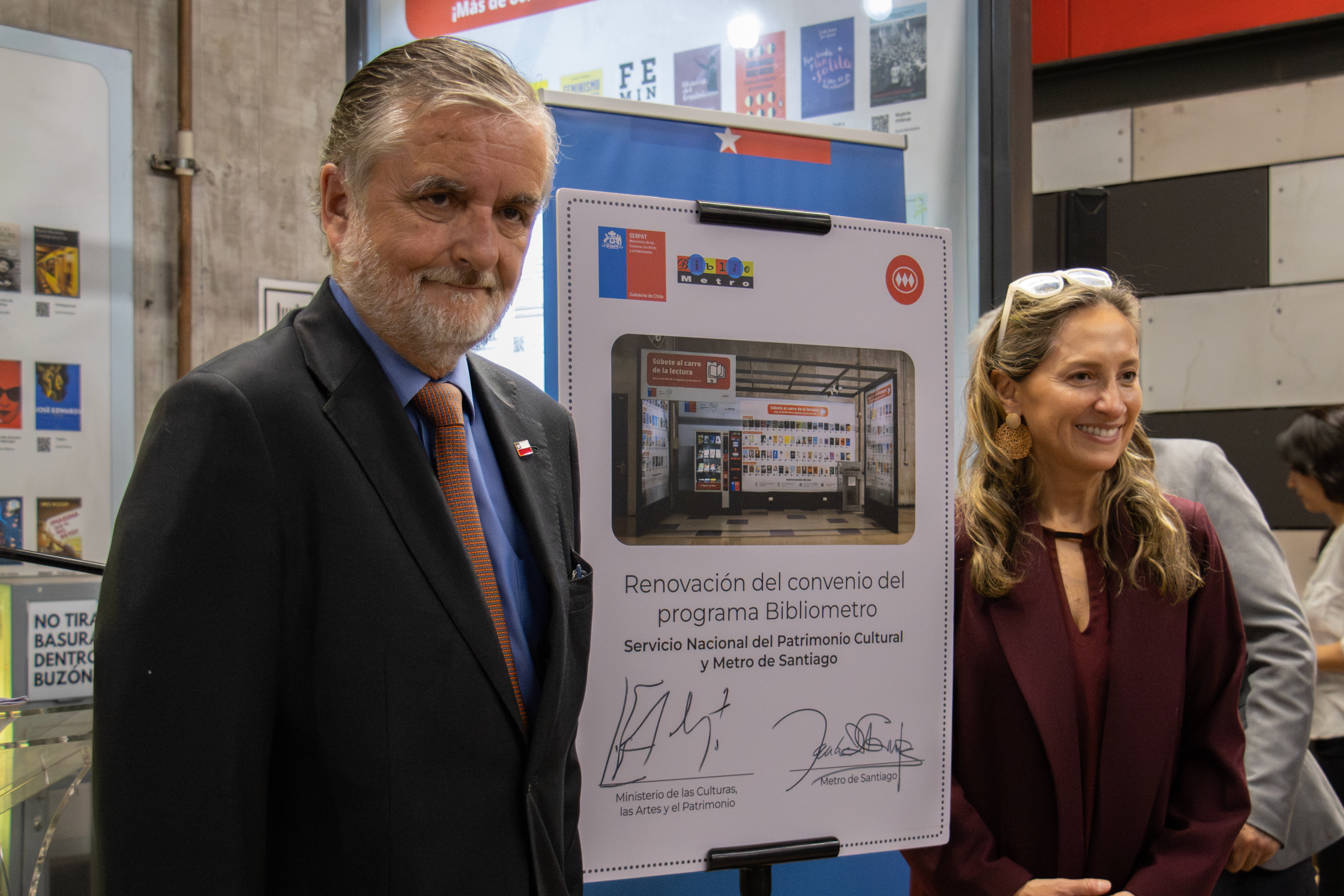 Esta mañana, el ministro de las Culturas, las Artes y el Patrimonio, Francisco Undurraga, junto al director de Metro Arte, Javier Pinto, encabezaron el 30° aniversario de Bibliometro en la estación Ñuñoa de Línea 3 como parte del Día Internacional del Libro y Derecho de Autor. La instancia, impulsada por Plan Nacional de la Lectura, Escritura y Oralidad, contó con la renovación del convenio entre Metro y Ministerio de las Culturas para implementar el servicio bibliotecario en distintas estaciones de Metro de Santiago, la cual permitirá la continuidad y proyección del programa Bibliometro como una política pública de acceso a la lectura a todos los viajeros.