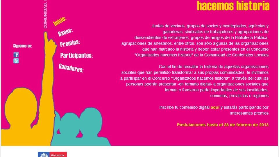 El certamen se realizó para rescatar y reivindicar la labor de las organizaciones sociales en Chile, el Programa BiblioRedes del Sistema Nacional de Bibliotecas Públicas (SNBP) - DIBAM, a través de su Comunidad de Contenidos Locales, realizó el Concurso "Organizados hacemos historia". El premio es un Samsung Galaxy Ace, por categoría y pudieron participar funcionarios de las bibliotecas públicas y sus usuarios.